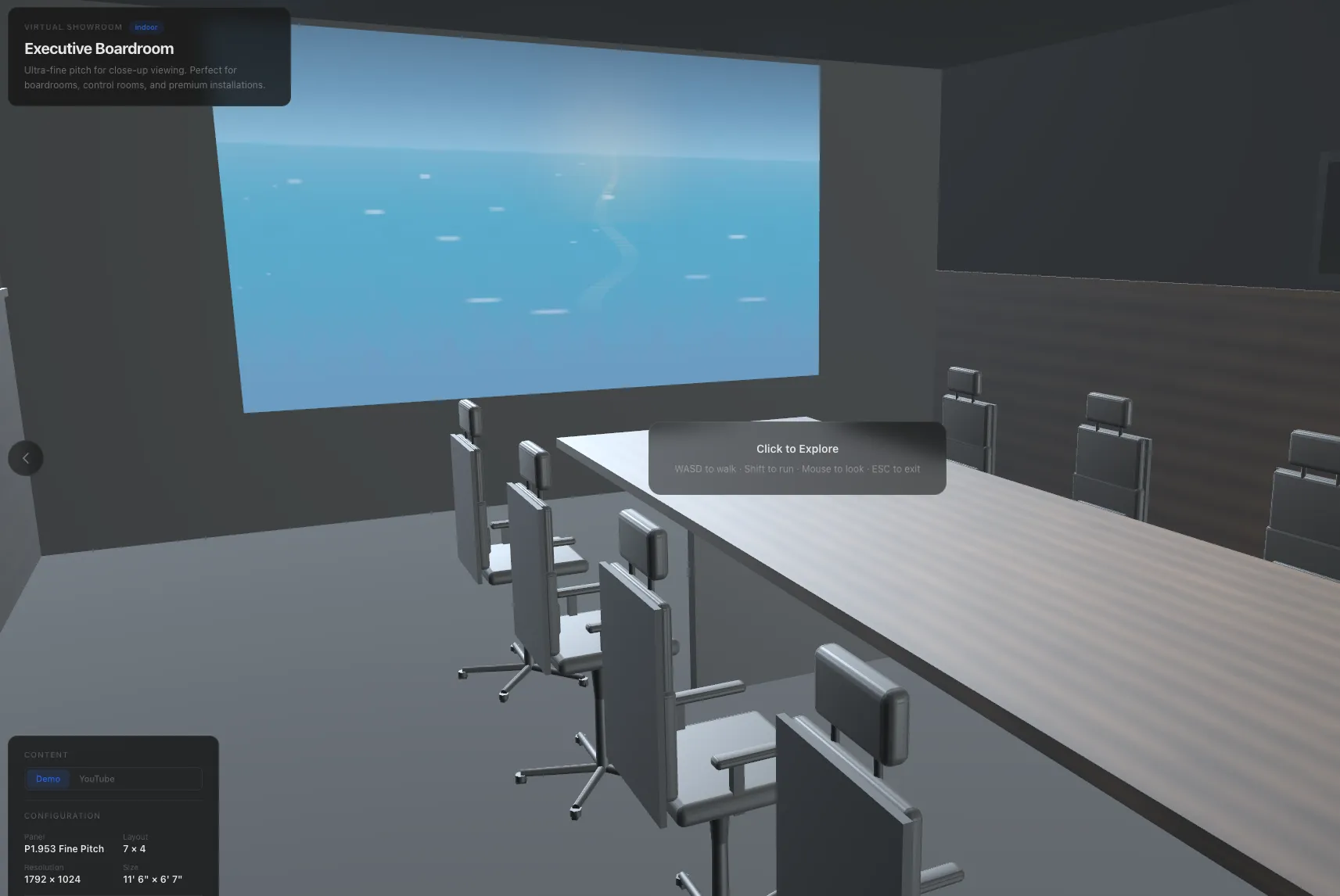 Our 3D showrooms aren’t renders of empty rooms. They’re modeled after real spaces — corporate lobbies, boardrooms, retail stores, outdoor monuments, arenas. Each one shows the optimal screen for that environment, already sized and mounted where it belongs.